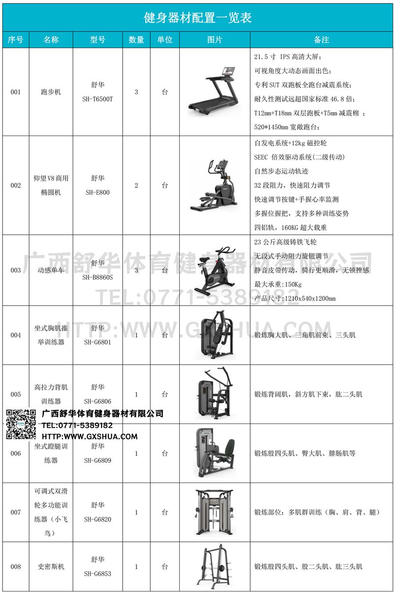 主要配置推胸、高拉背、蹬腿训练器、小飞鸟,可以锻炼胸、肩、背、腿等各部位的肌肉,满足使用者全身锻炼的需求,满足在有限的空间里,更高效的, 更多人进行训练的目的。