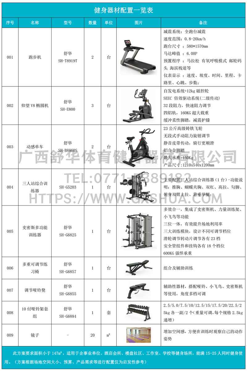 此方案要求面积小于111m²,适用于企事业单位、酒店会所、楼盘社区、工作室、学校等健身场所,能满10-15人同时健身使用。(方案根据场地空间大小、预算、产品需求等进行配置仅为启发性参考)