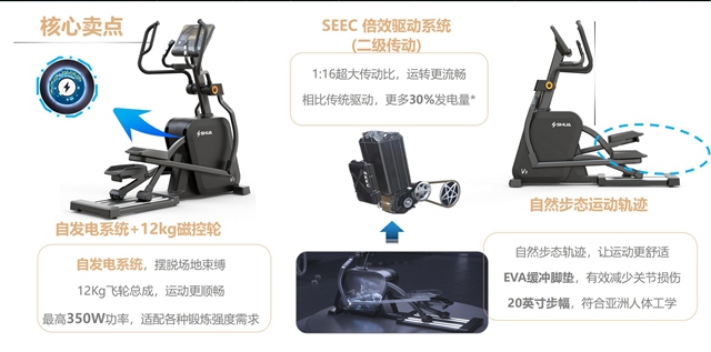 安全稳重,细节制胜。星空xkV8椭圆机是一款高安全系数的椭圆机,整体设计遵循人体工学科学,缓震踏板中添加减震层设计,能够有效减少运动冲击带来的关节损伤,且最大支持160kg载重,满足更多人群。手握心率监测、多功能置物架、自发电系统取代统电源......在细节上,新款椭圆机站在健身者角度,添加了不少设计者的巧思,为健身者带来更贴心的体验。