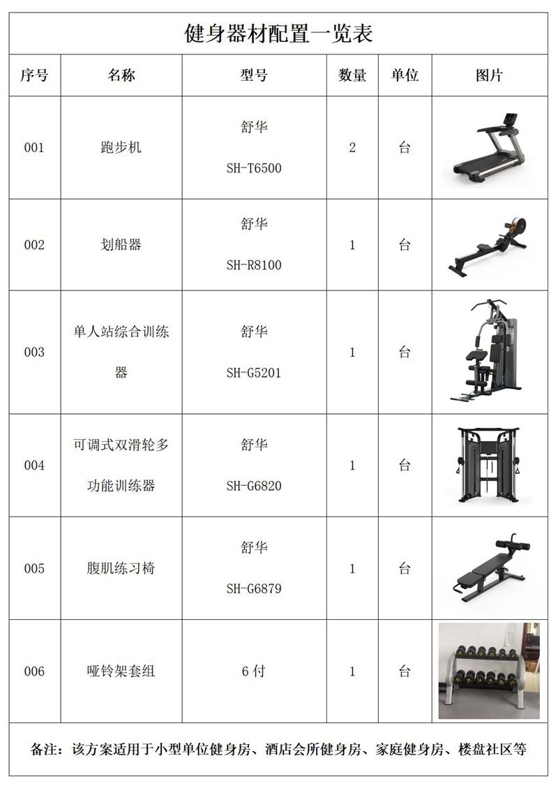 此方案要求面积小于50平米,此方案推荐小型企事业单位健身房、酒店会所健身房、家庭健身房等配置。能满足5-10人同时健身使用。