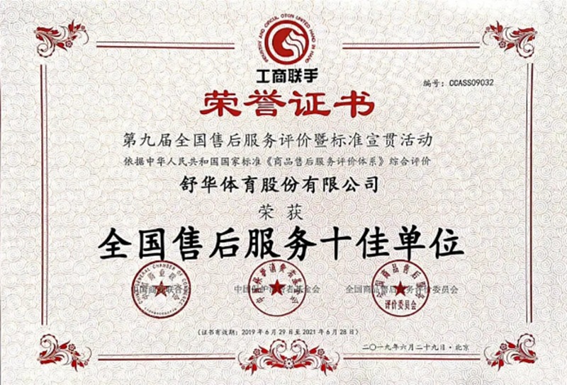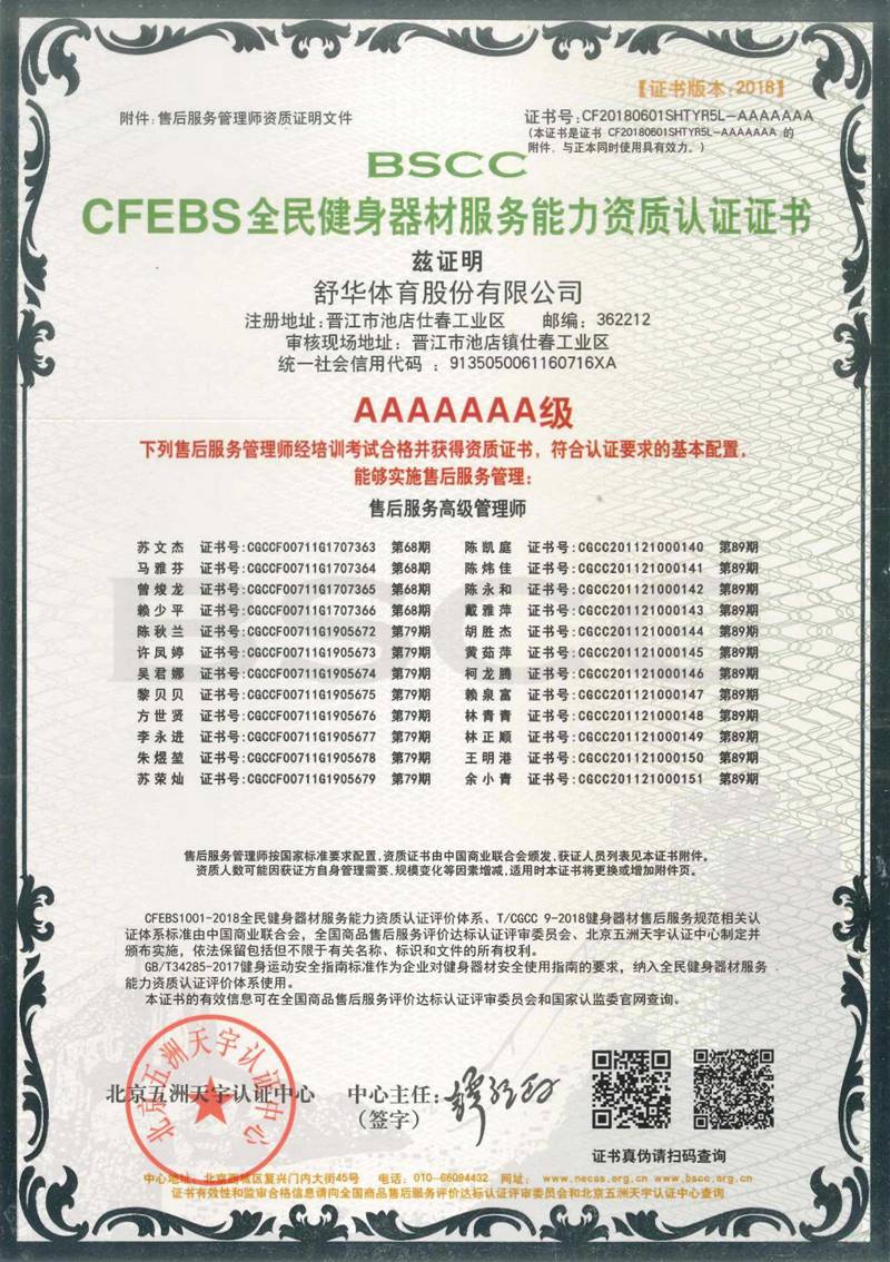 星空xk以用户满意作为服务追求,凭借专业的技术能力及服务保障能力、有效的售后服务体系,获得“BSCC-CFEBS 全民健身器材服务能力资质认证证书 AAAAAAA 级”,部分员工经培训考试合格并获得“BSCC-CFEBS 全民健身器材服务能力资质认证证书-售后服务高级管理师(AAAAAA 级)。