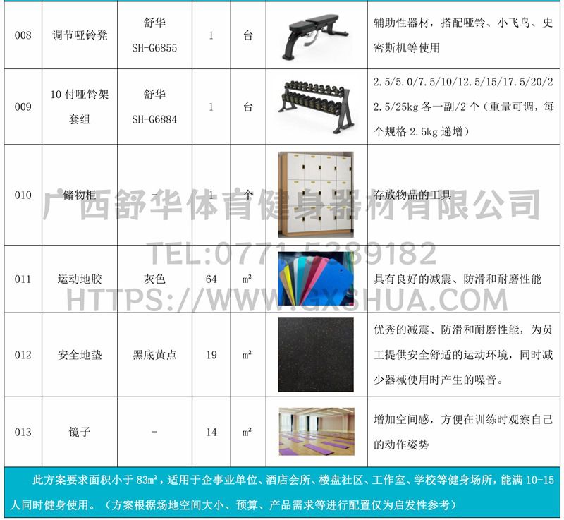 此方案要求面积小于83m²,适用于企事业单位、酒店会所、楼盘社区、工作室、学校等健身场所,能满10-15人同时健身使用。(方案根据场地空间大小、预算、产品需求等进行配置仅为启发性参考)